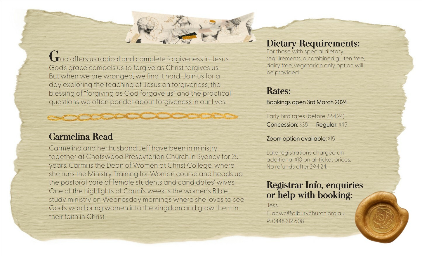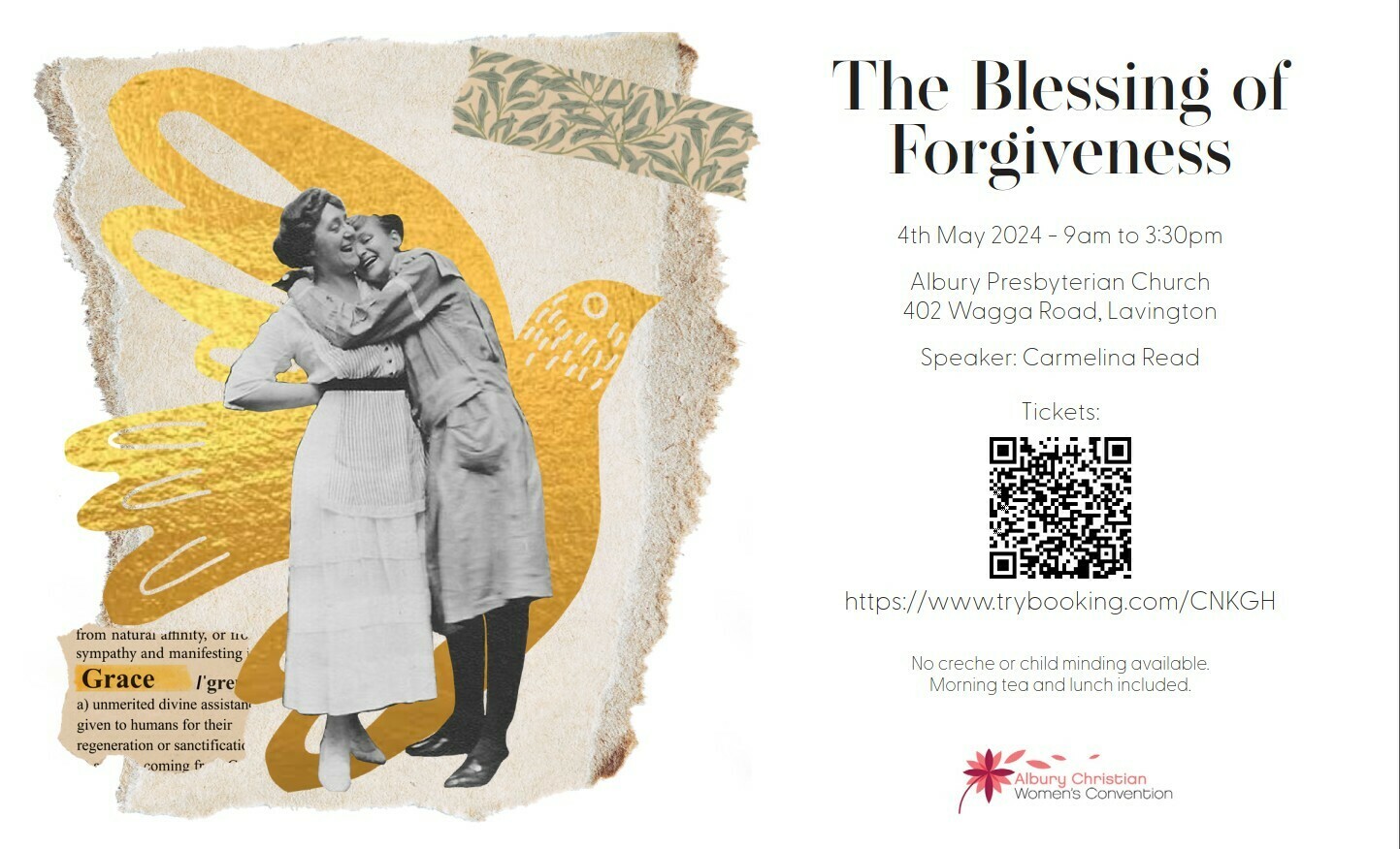 ACWC 2024 The Blessing of Forgiveness 4th May – 9am to 3:30pm This year’s speaker is Carmelina Read Session 1 Session 2